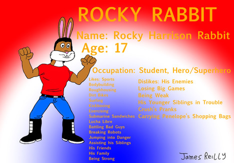 Bio: The oldest child of the Rabbits, Rocky is athletic, strong and enjoys roughhousing with his brother Crush. He plays a variety of sports such as football, soccer, basketball, baseball, hockey, bowling, etc. He is also skilled in various forms of martial arts such as kickboxing, Mexican wrestling and parkour. He also spends time working up body strength to become stronger than he was before. When Slizard’s goons captured him along with his younger brother and sister, the reptilian scientist thought that a muscle-bound rabbit would make the perfect combatant. But Dr. Slizard thought wrong as Crush set him free and used his new abilities to smash some skulls. Joining alongside with Crush and Penelope, Rocky always has their backs for he is the brawn of the group thus showing bad guys that he is not to be messed with ‘cause he is one hell of a guy.