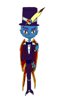 Balan is a tall, lean humanoid figure that wears a white magician suit with a white top hat with a red mask around it. He has big yellow eyes and black skin with a wide grin on his face. Balan also has neon green locks