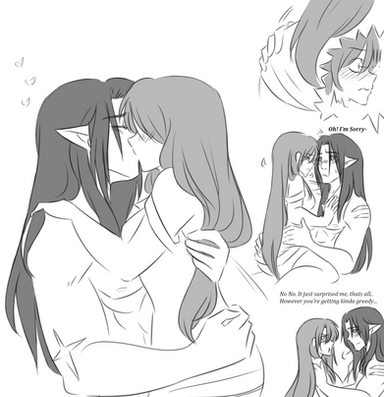 He inhales sharply as her hand trails back down his neck to his shoulder. He pulls her under him and looks down at her smirking playfully back at her.