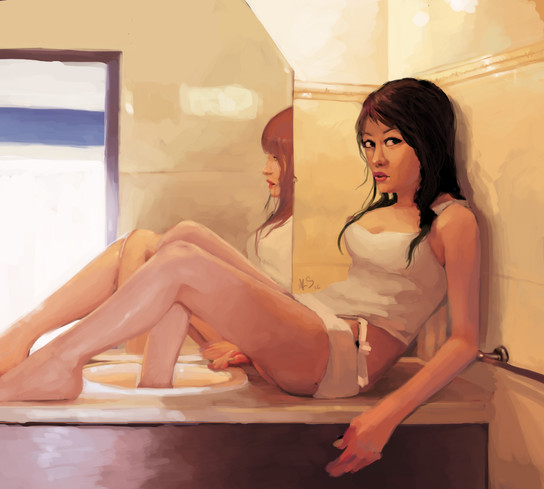 I usually don't comment but I just had to. The thing that stands out to me most about your paintings is your incredible ability to figure out what needs to be rendered in detail and what doesn't. I was staring at this piece for a whole minute before I noticed the faucet was barely sketched in and the tassely bits on the rug were mere strokes. You have an incredible knack for knowing exactly what a viewer is going to notice. It's almost like observation in a real setting, where you don't take in all the details. Anyway, brilliant work, and I hope that made at least a touch of sense. C-: