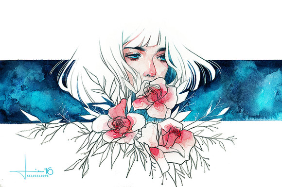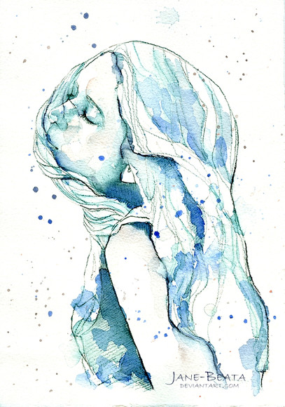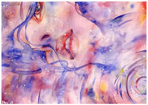 It is usually not ideal using watercolor in portraits (abstract or realistic) instead of more 'sculptural' medias as oil. However she's successfully found out its own advantage: the comfortable effect, transparent, feather-like 'visual weight'. The face was shaped such that gives out relief and relax, and surely sub-conscious temptation and if any, a little blue emotion. Eyes like clear-water wells, flowers more than decorativation but also notes of atmospheric mood. Like this a lot.