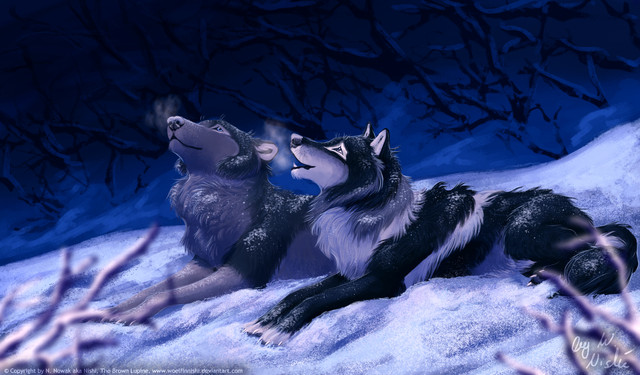 The cub was exhausted but as he lay near his mother he found the time to shuffle his nose in the white cold stuff beneath him in curiosity. The alfpha male howled a howl that came deep from within him, he was the protector that night.