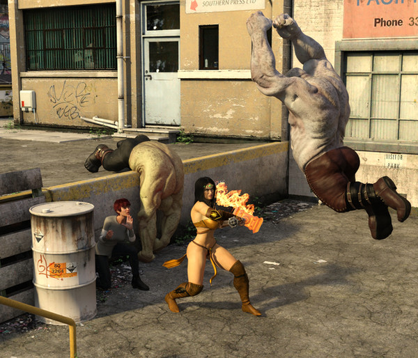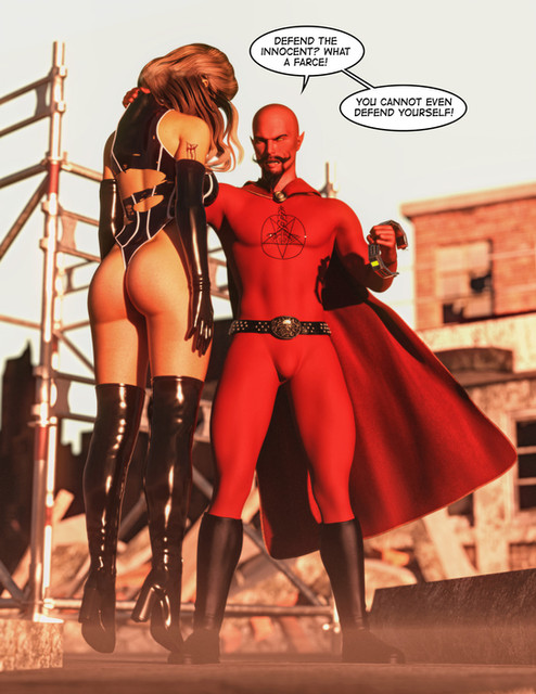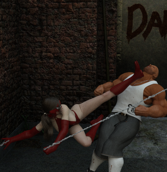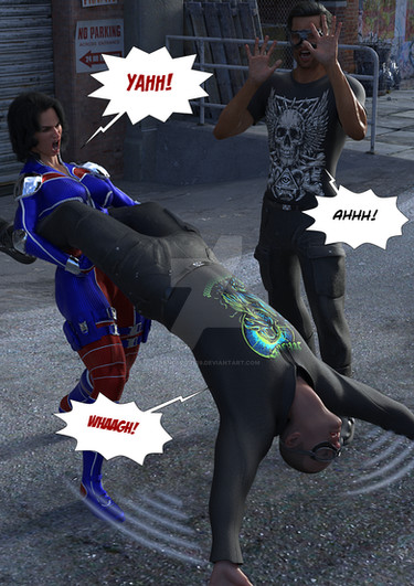 It should be noted that members of the Paradigm Agency of Superheroes are strongly discouraged from beating information out of criminals ("They'll tell you anything to make the pain stop, and it won't necessarily be the truth."), but Shinoba makes an exception for Tom Trouble. His information's good, but he only gives it up when she puts pressure on him. In fact, he seems to rather enjoy it.TOM: There's a new player in town! A villainess calling herself Hare-rier!