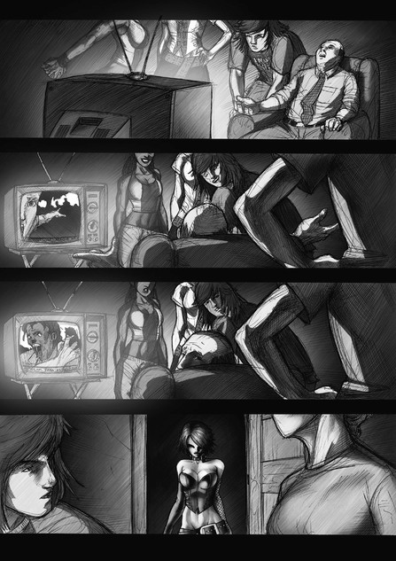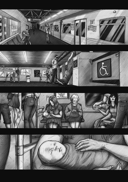 Like the other pages I used Bic Pen (yes, the cheapest pen you can find around but the best to make the style I wanted) to make the traces of everything but Felícia, the protagonist. You'll notice that she's traced with nankin and a more smoother rendering than the rest of the illustration. For it I used mechanical pencils and Photoshop. The rendering of the rest of the pages was done with Photoshop too. I wanted to make her more "divine" at the looks of reader to represent her new state after her transformation. Now she is livin' the way she wants and the rest of the world seems like "corrupted" in some way to her.