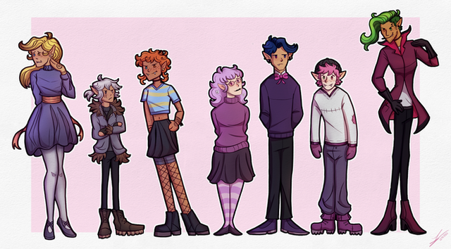 Commission for kururu418Drawing of their Ocs (Boy with purple hoodie, Girl with green hair, and girl with blonde hair) and PrincessCallyie Ocs (The baby, The girl with 3 eyes, The tol girl) ~