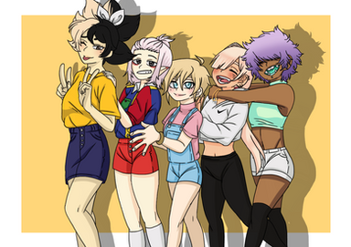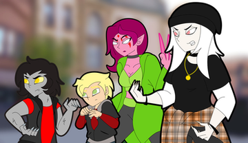 The blond girl is Nia and the green hair boy is Astro whose girlfriend is Maria, the 3 eyed girl is Vera and the cool girl is Amber.