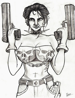 your perspective is very well done. u might want 2 consider using foreshortening more: make her hand n the gun a bit bigger. it'll take a couple tries, but the effect would add to the image.
