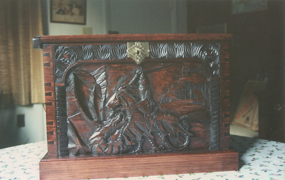 A work in progress picture of the lid to bass wood chest that will be mahogany stained . Other then cutting the wood to length pretty much everything was done by hand with traditional wood working tools . Including the dove tails and the molding . This was a lot of fun to make ,but it took quite some time to make and carve .I don't mind if you share my pictures , but please let me know you are and link to here and don't take credit for my work . Mostly I just want to see who and where they get used . Probably an ego thing .