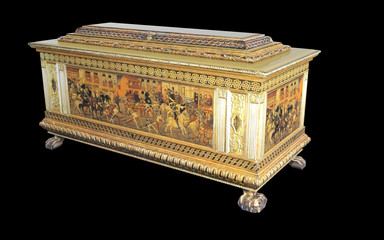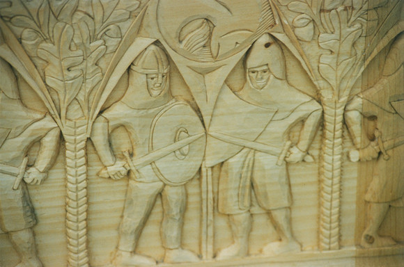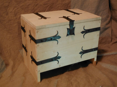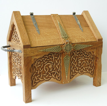 This design is based on a 13Th century chest from France . It's about 20" high by 48" long and 18" deep " front to back " . The original had a solid piece of wood for the lid and I couldn't tell what was carved on it . That didn't matter as the person I made it for is a huge fan of the vikings and wanted some of those elements incorporated in the design . Other then the lid the rest of the chest was made like the original and I carved it by hand using traditional carving tools . It's a clever design that's draw-pegged together . It was a nightmare getting all those joints on the ends to fit up at an angle like that . Most chests were a straight 90 degrees on the end and I understand why now . The vertical boards are 2" thick rock maple and the center boards are 1" thick bass wood . " 8/4 and 4/4 for any wood workers "That's the reason for the color difference .Sorry about the white marks , I had to scan a photo and the owner put tape on the picture by accident .
