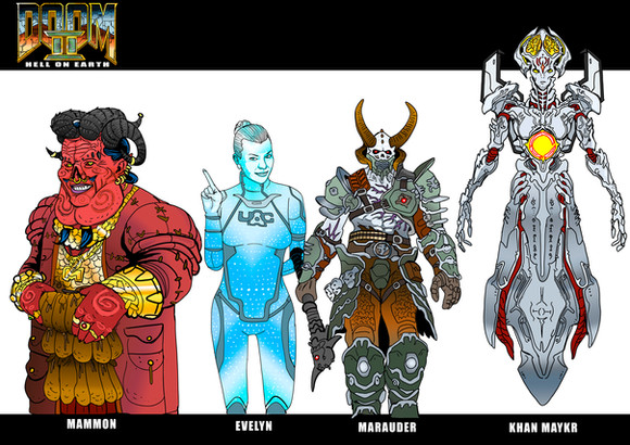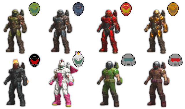 Doom Marine: The upgraded Praetor Mark 4 suit, which Doomguy gains from the Fortress of Doom. Suit is much more technologically advanced, with complex visor and internal systems which allows Doom Marine to travel Hell and return again unharmed. The suit is described as being made from nearly impenetrable material, and may be responsible for what appears to be the Doom Marine's superhuman abilities. It is complete with shoulder mounted equipment launcher, able to fire frag grenades, Ice grenades and belch fire. Doomblade, extended from the wrist. Armed with a Super Shotgun with a Meat Hook attachment.