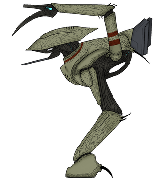 The Strider is a large three-legged arthropod-like Combine Synth that stands approximately 15 meters tall or 50 feet. They serve as the Combine's main heavy ground assault unit. Striders are capable of pursuing hostiles in both confined streets and open plazas, even crouching down to fire at enemies who seek cover under overhangs or in bombed-out buildings. The Strider's body is covered in a smooth brown carapace or exoskeleton. On the "head" of the Strider is a rapid-fire pulse cannon, with a heavier warp cannon suspended below. The three long legs of the Strider are tipped with sharp spikes and a rosette of finer, hair-like spines.