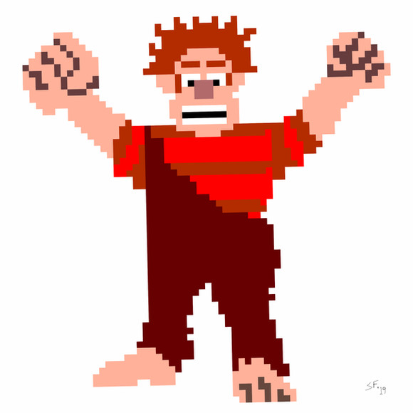 The protagonist of the of his name of Disney film, the main villain from the game "Fix it Felix" who's tired to live in the dump, he's a stronger wrecker, but he wishes to not be always a villain, so he have a solution to found a medal but failed when enters another game (Sugar Rush) later when meet Vanellope, helps her to win in the race to appear in the select menu (the selected name is plucked with cables by King Candy, that's why is a glitch)The next movie "Ralph Breaks the Internet" it's possible to make troubles in the internet, when is in with Vanellope who accidentally is in the party with Disney Princesses in the web section of "Oh my Disney!".