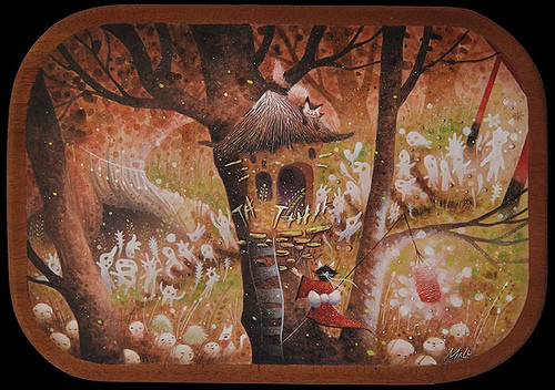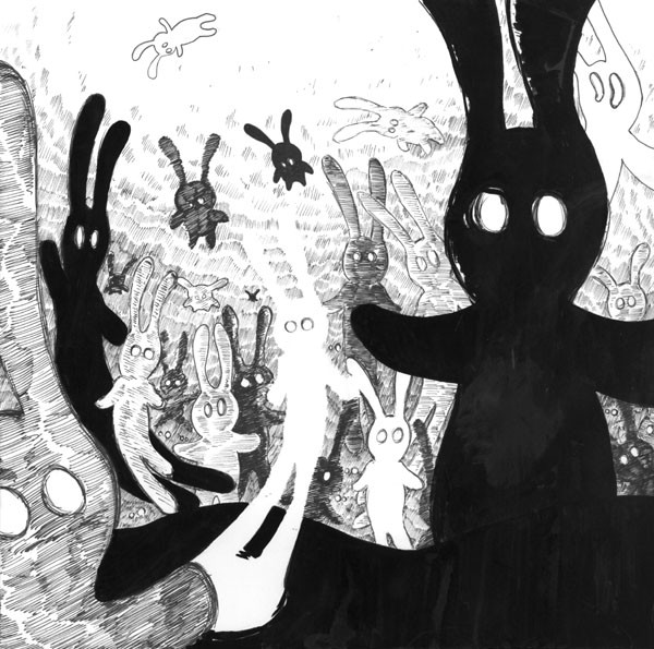 My contribution to Greg (Crayola) Simkin's group show entitled "Inle". 100+ artist interpret the Richard Adam's "Watership Down" character, the black rabbit, the embodiment of death in the story.This is my take.