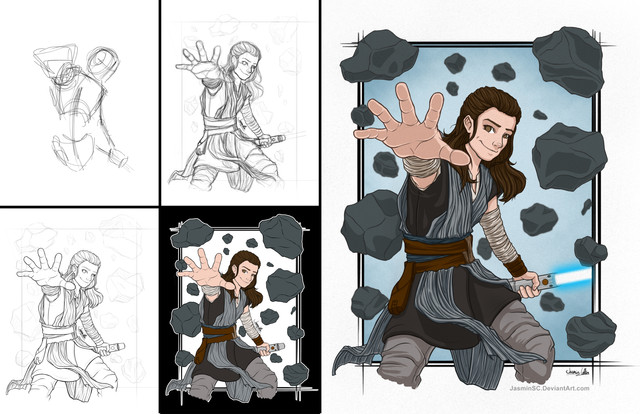 This was clearly inspired after The Last Jedi came out. I know this was inspired by a doodly sketch I did on my phone with my finger -- I'll post a collage of the progress next. (You can find it here: www.deviantart.com/jasminsc/ar⦠)
