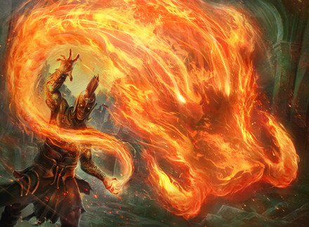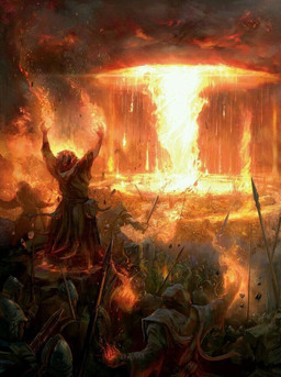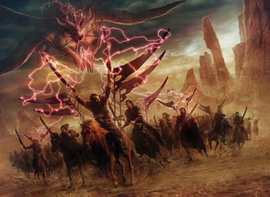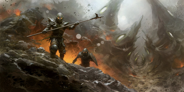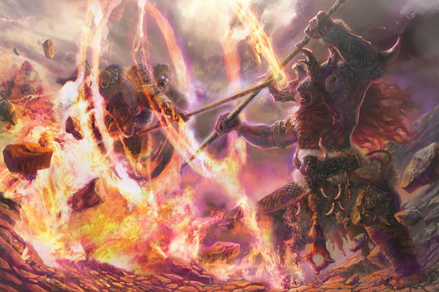 Done for Magic: The Gathering set Dragons of TarkirIllustrating a spell effect. Pretty classic red spell, fire and chaos on the side of a mountain. The armor was especially difficult to render, as it is designed to be very spikey and bulky, and hard to show on lots of figures in motion. I decided to make them mostly dark, almost silhouettes, and facing away from the viewer, so they didn't draw attention away from the smaller figure in the background (which I drew further attention to with leading lines and creating a circle shape around him with the shockwave effect), and the spell effect itself, which was kind of the whole point of the card. Definitely one of the trickier magic commissions I've done.