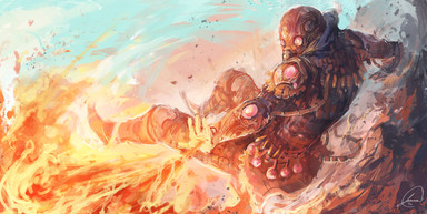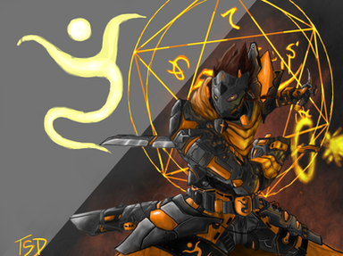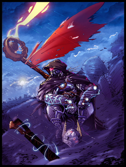 Nicely done mate. You did great with the pose and you did an awesome job with the design. The background looks good, but it could look a lot better. YOu threw in a lot of details into your character and making him dynamic, but your background looks flat. I would say that you could have really made this come to life if you spent more time with your backgrounds. I know I've been a broken record on this, but try doing a fantasy landscape painting. It should really help you with detailing your backgrounds. You seem to have a pretty good idea on perspective and color choice, so for that I do give you credit for.