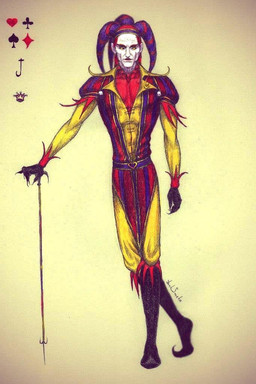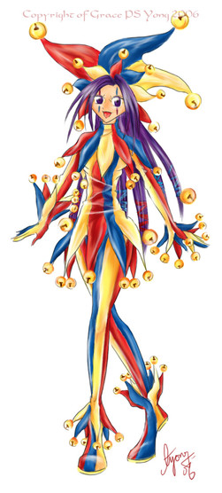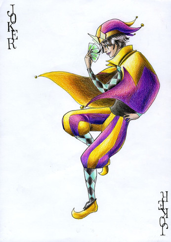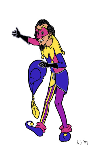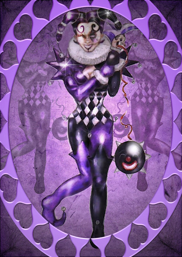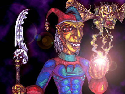 Nice piece overall. The shading is excellent, and the bold warm colors of the jester contrast beautifully with the purple background. Just one nit though: Becuae the jester is off-center, and there's nothing really to balance her out on the right side, the piece feels a little off-balance. Trimming a little off the right side might help with that. Good job.