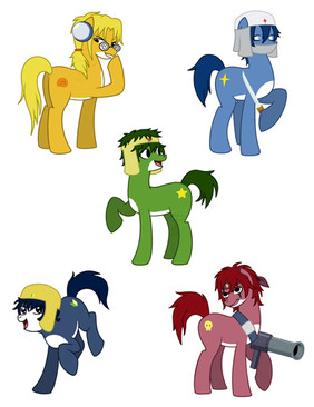 I made him a army Sergent. So his talent is being very angry at others to get them to do better. (I only based their designs off Germany and Italy. Everything else I will be designing myself. Its the reason why I say "Inspired" because they are not ponifications of the characters. Atleast not exactly) I also felt that him being potato related or being cu-co clocks would make him far to similar.