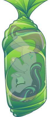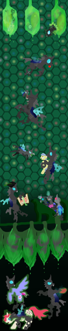 Then all her sensations came back, and she felt it coming from all four hooves. This was quickly followed by her noticing her cutie mark, or rather, the empty space where it should, followed by the hive chamber and countless cocoons that still hung from the roof of it. Her eyes widen as she examined her surroundings, and her body.