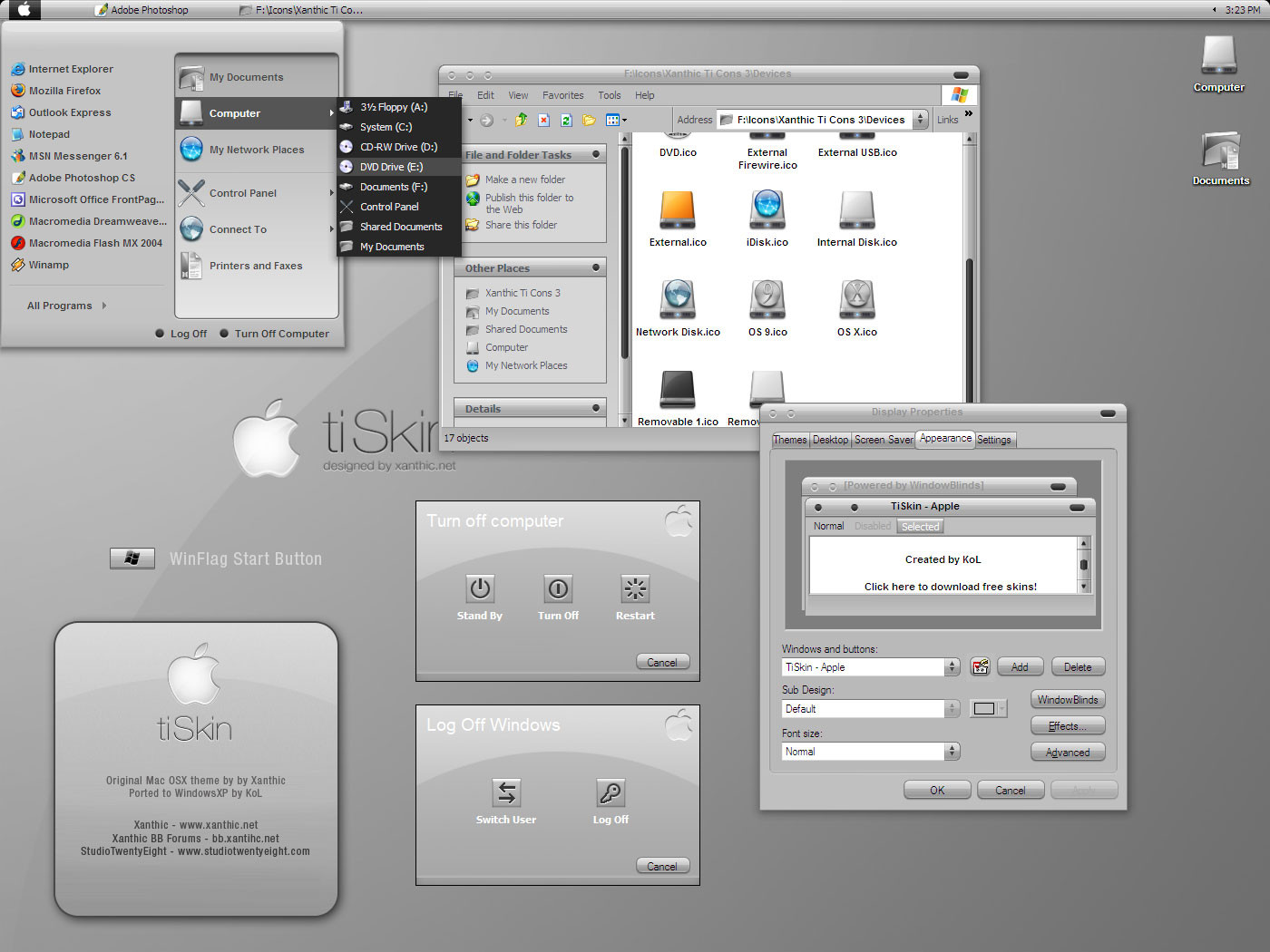 The theme includes Apple and WinFlag start button, compact and normal start panel and wallpapers made by Xanthic.