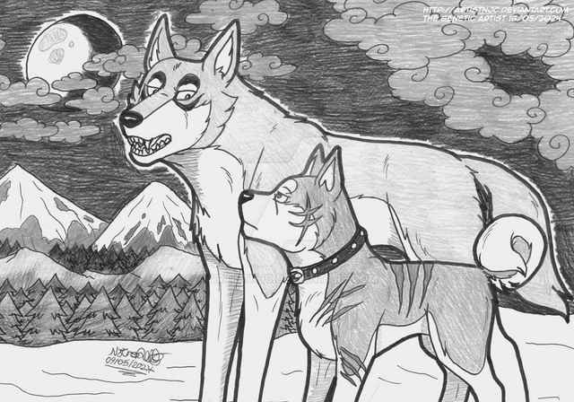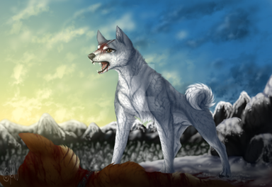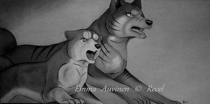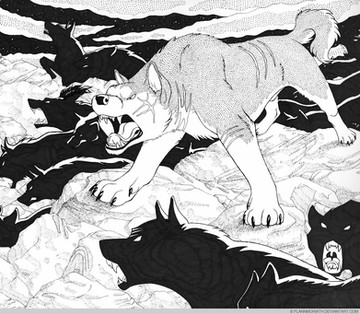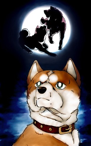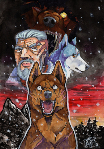 Teikäläisen viivatyöt on kyllä ilo silmälle, sillä kynä pysyy selvästi teikällä kädessä ja yksityiskohdat toimii. Tosin tässä työssä se kokonaisuus on asia joka meikästä vähän tökkii. Kuten totesitkin, on punakypäräsi melko tönkkö ja kuonoltaan liian koiramainen. Suurin ongelmani on kuitenkin Riki. Voi Riki. Kyseinen koira on juuri se suurin legenda sarjan koiramaailmassa, urosten uros, koirien Arnold Schwarzenegger ja kaikkien isähahmo. Muinaisten matagi-koirien viimeinen todellinen edustaja on meikälle hahmo, joka pitää aina piirtää niin mahtavaksi kuin mahdollista. Ja siinä teikä vähän niin kuin epäonnistuu: piirtämäsi koirat tuppaavat olemaan joko normaaleja tai söpöjä. Tämä Riki tippuu siihen normaali-kategoriaan, mikä ei todellakaan riitä meikälle. Varsinkin kuvan teemaan sopisi erittäin hyvin, että Riki olisi juuri mahtipontinen matagi-koira, urhoollinen karhunmetsästäjä, sillä se ikäänkuin on pointti koko tämän suhteessa Akakabutoon (tai siis näin mielestäni). Piirroksessasi ei vain ole sitä tunnetta.