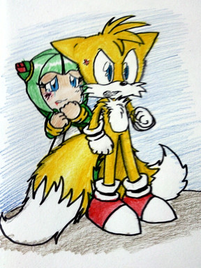 Heh... rather amusing! I love Tails' expression here... he looks so embarressed! It can't be easy being such a cute, cool and awesome little guy, when all the young Sonic girls are after him!