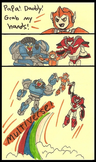 Great art piece! The idea is brilliant, and the comedy is ace! I first though Optimus was asking Knockout if he wanted a cup of Tea to make him stop asking questions XD Which was as funny as what you meant to communicate though this piece XD In addition all characters are well drawn, and the predicament both Knockout and Breakdown have found themselves in is rather interesting. It is coloured with watercolour is it not? c: