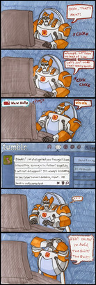 Well, the whole scene is based off of a Tumblr event involving highglossfinish and bruiser-buddy-breakdown. Shortly after Team Prime takes control of the Nemisis, Knock Out and Breakdown are taken into custody and held for questioning for a few days. They both had their personal datapads sub-spaced, and were using them to communicate with their Tumblr audience for a while, until the frequent outgoing transmissions alerted the Autobots. Prime confiscated Knock Out's datapad, and Breakdown opted to snap his own in half, rather then let Optimus seize it.