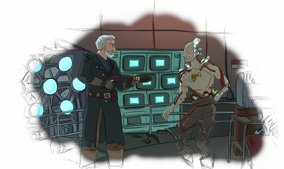 I am incredibly proud of this. Probably the best computer-completed color-and-ink job I've ever done. Penciled by hand, inked and colored in Photoshop 7, completed 2004 (just a couple of days ago, actually).