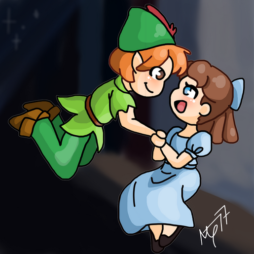 The designs here are heavily inspired by Disney's Peter Pan as you can probably tell, but over the course of developing this AU I ended up making them more of their own characters- I'd say they deviate quite a bit now, personality-wise. Here, Wendy is an alien-obsessed sci-fi lover who's being threatened with being sent away to a stuffy all girls' school to "straighten her out" and make her more socially acceptable. Peter is an escaped half alien half human hybrid (the aliens in this case being fairies, like Tink!) It's a bit of fun. Maybe I'll put more of this AU here later, hehe