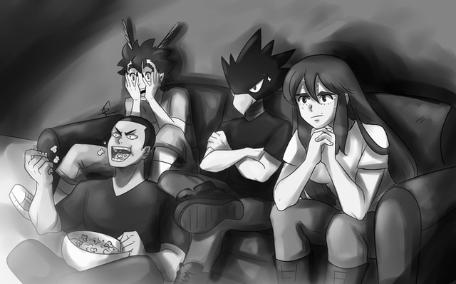 Okay, so this started as a simple sketch of Shiori geeking out to Ground Zero. Then, I thought, "Well, what if we got Bakugou's reaction to it?" And from there, it became, "What if she were with the Bakusquad??!?!?!?"And that's the story of how this picture came to be. Some context:
