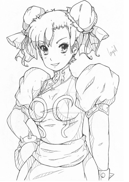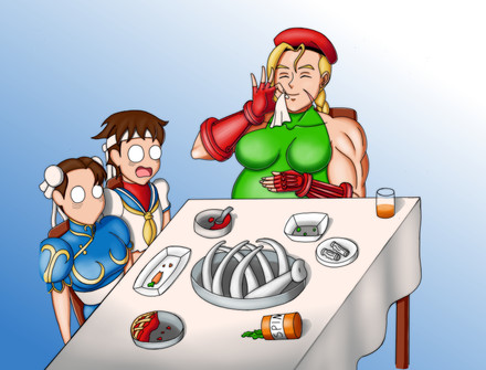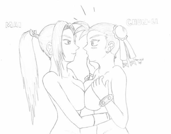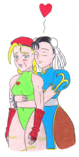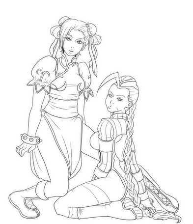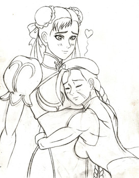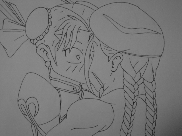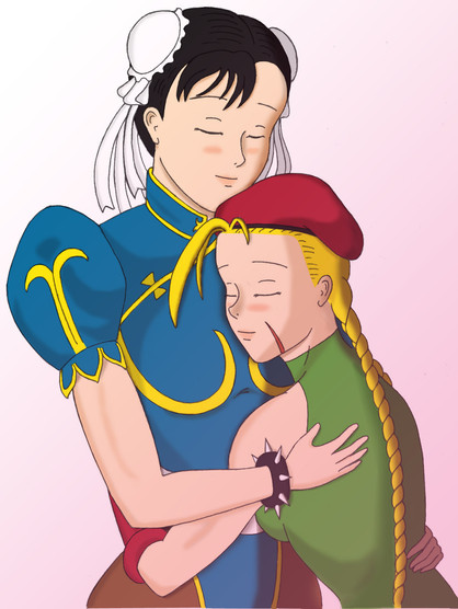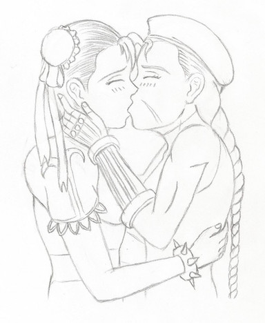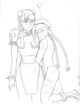 Adorable!!! I remember thsi piece, it's one you should color! I like Cammy without her beret, and you can tell she's standing on tip-toe to hung Chun because she's so little!