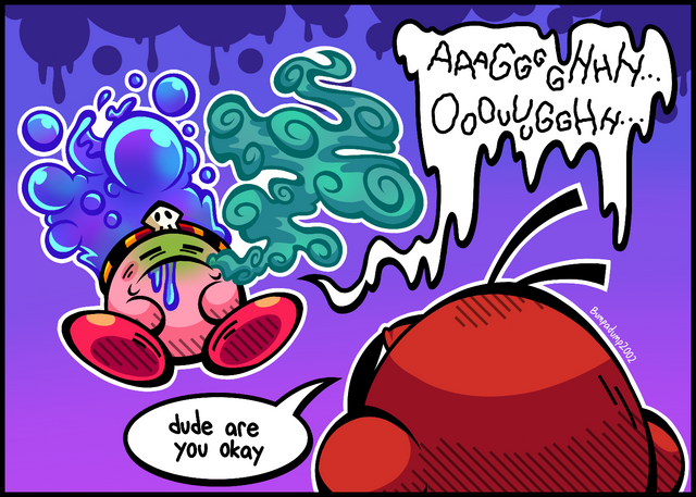 When ever I fight 02 in Kirby64 and get to the part where you have to shoot his green, spiky tail. It always looks like to me that the green gas stuff is him farting on me!Seriously! That's what it seems like! I mean it's green gas that comes out from around where his tail is, and it hurts you. I don't think I need anymore evidence. ._.