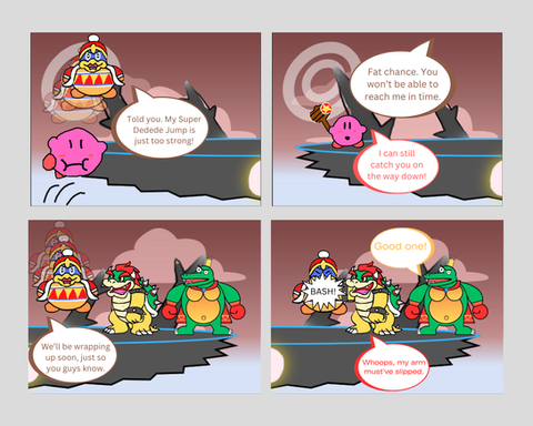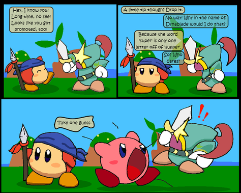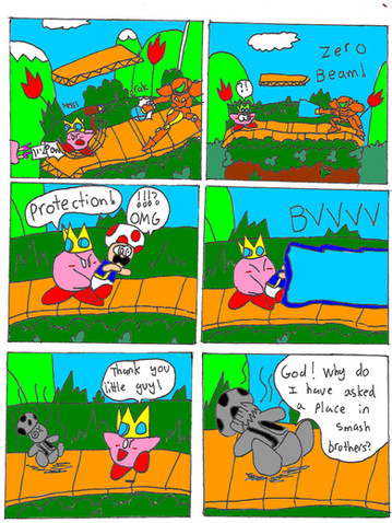 It's doooooooooooooooone!!!!!So yeah, Kirby actually tries to help Meta Knight feel better, but things get a little washed up-*bricked*XD