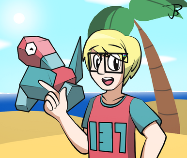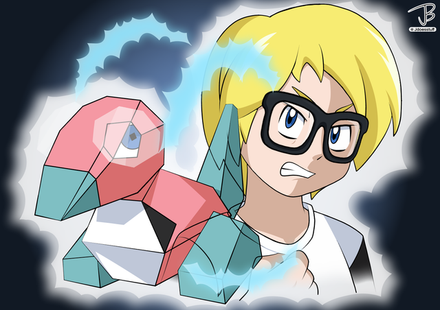 Fake screen I made of my Pokemon trainer persona, Jay and his Porygon in the style of the original seasons of the Pokemon anime.(Junichi is Jay's Japanese name)