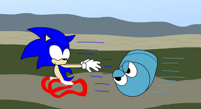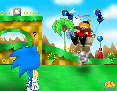 In attempt to rescue all his friends from the mechanical clutches of Dr.Robotnik, Sonic uses his trademark move, the spin attack to burst through robotic badniks who are using the life force energy from the flicky creatures to power themselves.........Here Sonic saves a chicken flicky called Cucky. And I wanted this to take place somewhere different, like Spring Yard Zone.