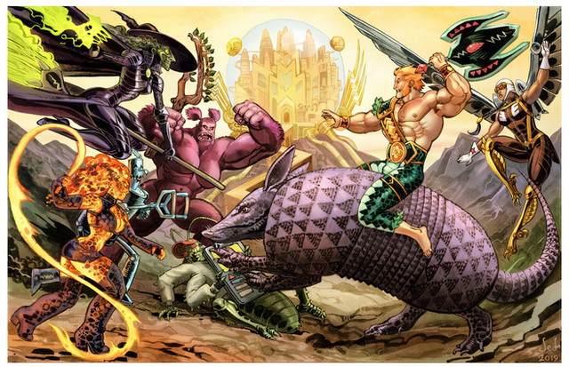 Pencil sketch made Aug 17th 2010, with some clean up and shading in photoshop.Drawing done for of his eponymous character Ritualist hanging out with his deadly deadly mercenary crew in some tropical bar.