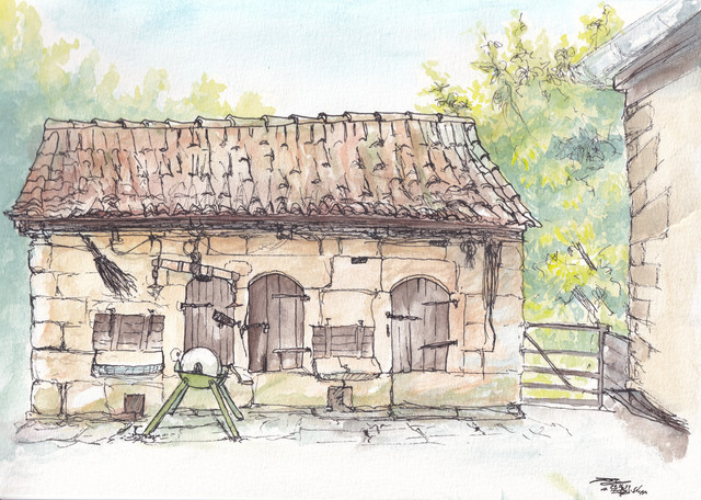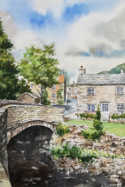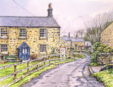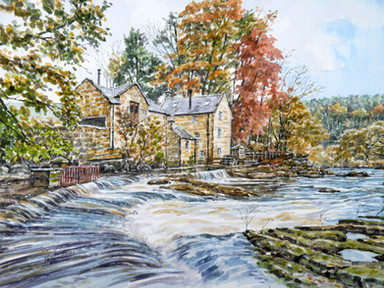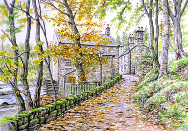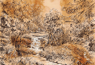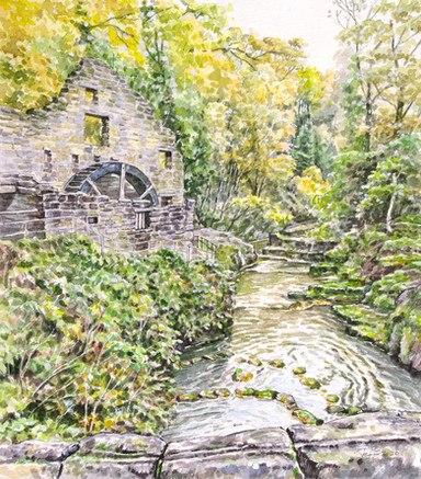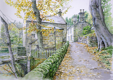 Restored watermill at Rothbury, Northumberland.Watercolour with ink, graphite and white gouache on 16 x 12 ins Bockingford paper.
