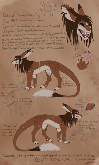 Never did expand much on Sev over here, did I? well, 037 started as an AU Jai, but she's become her own character, so... Here she is.Sev is an experiment in fusing different species together using alchemy (yes, from fma). The thing that's unique about Sev is that she was made using a human and various animals instead of only animals.