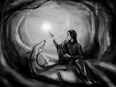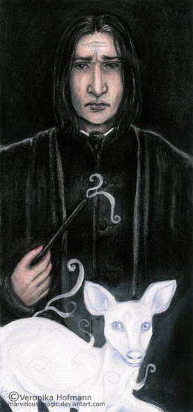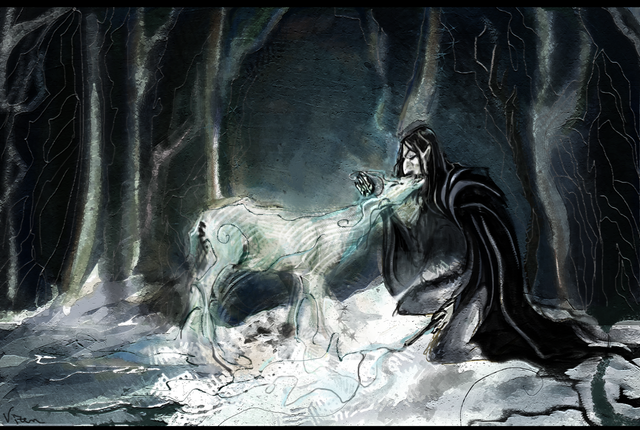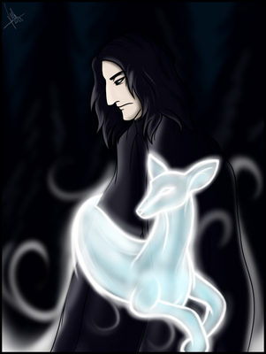 I like the cave-painting style of the background and the Patronus, and the overall earthy/smokey colors. Definitely matches Snape's mood.