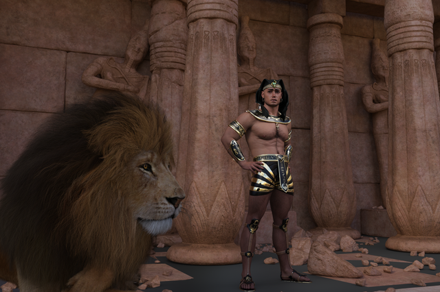 G8M with Stefon skin and lots of muscles, royal clothing made in Marvelous Designer, courtyard from DAZ, lion by AM, all rendered in DAZ Studio 4.12 Iray with color adjustment and overlay in Exposure.7 different 4K HQ images also without lion and clothing for all my Patrons.