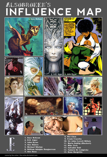 Here we go; My first stab at one of these Influence Charts.From left to right starting at the top (in no particular order) are my top 10 artistic influences, plus an honorable mention which will become clearer as my notes unfold.