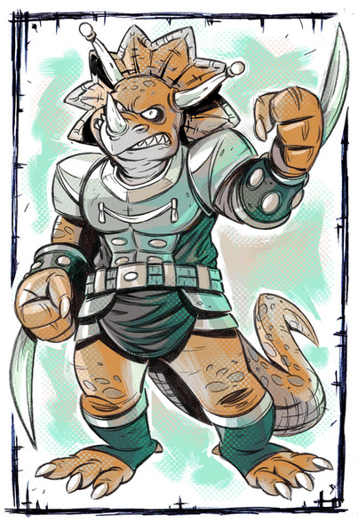 Marvel Animation Character Design, HULK AND THE AGENTS OF S.M.A.S.H., General Rossasaurus. Digital art.In the Second Season episode entitled, "Days of Future Smash: The Dino Era: Part One," we encounter yet another bit of silly fun in an alternate universe where intelligent dinosaurs rule the Earth. It stands to warped reason that, in that dino-verse, the version of General "Thunderbolt" Ross would be an armored type of dino. Enter: the ankylosaurus General Rossasaurus. It was difficult to keep a smile or a smirk off my face as I designed this character. Hey, it's a show for the kids, right? And dinosaurs are all the rage again.