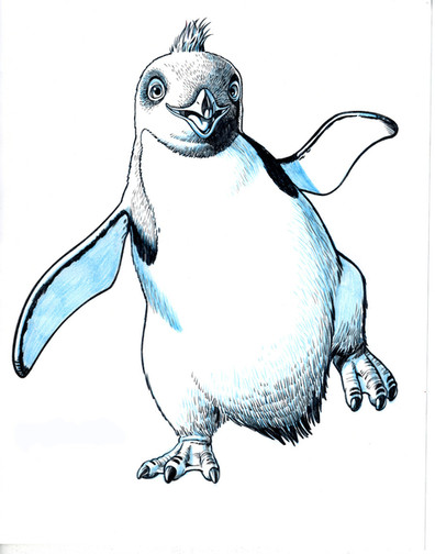 WB Marketing Art, HAPPY FEET, Toddler Mumble. Pencil, Prismacolor marker.Found this old art in the closet. This is a marker comp I did for the Mumble pose that is posted elsewhere in my gallery. I worked this up as an example for the digital artists in my department, the freelance painter, and the project art director to show how I believed the colors and tones should be treated in realistic light. My intent was to conform to the image in the film as closely as possible. But of course, they all ignored this rough example, and did it their own way.