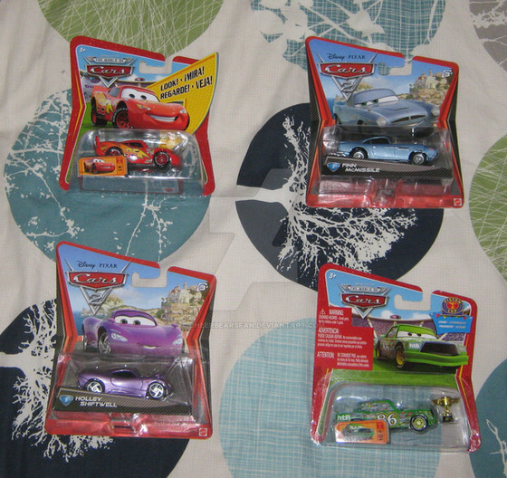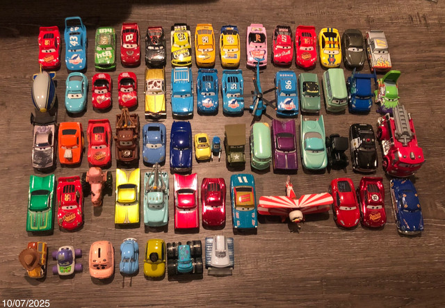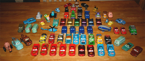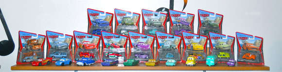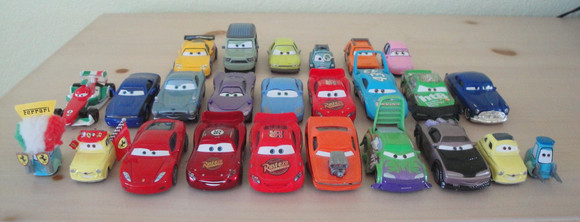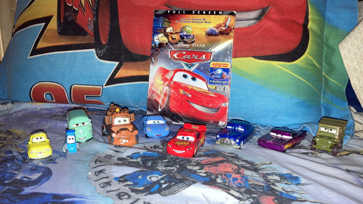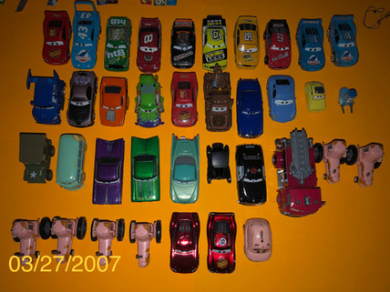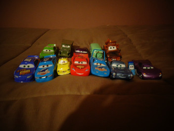 My Disney Cars Collection! I got it all in 2006 when it came out. I was 9 so I wanted pretty much everything of it, and I got a LOT of it.The top left is all of the regular Cars made by Mattel. Under that is the Cars DVD and Cars & Cars 2 Video game. And next to the Mattel Cars to the left are two mini cars (Mater and Sheriff) that came in a cereal box along with 3 bouncy balls. Under the bouncy balls is a remote control Mater and a remote control Lightning. Then under that is Ramone which came with a sucker and 9 Mcdonalds toys (they do look all chipped beacuse I would take them to the beach and the paint fell off). Then under that is 12 Cars that was a Disney Store exclusive.