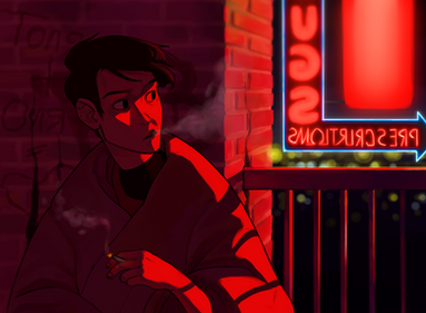 This picture was more difficult than I'd originally hoped it might be. I've never limited myself to a specific lighting scheme or color palette quite to this extent before, so it was a learning experience to say the least! I'm unsure how many hours I've dumped into this because I worked on it off and on for months - I only recently pushed myself to finally just finish it. Inspiration came from several hours of 80's inspired synthwave music (both off the Drive soundtrack, and more frequently from the band/musician Perturbator) and from the dynamic lighting in Telltale's A Wolf Among Us video game.------------------------------------------