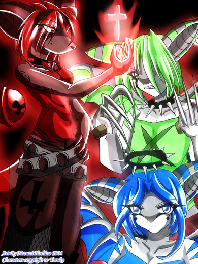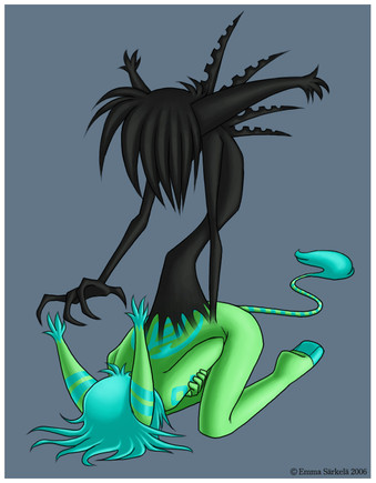 That aside, I really enjoy the variety of colors you've got here. Few people can blend such bleak, dark colors with vibrant, bright shades, and you do it with expertise. Not only that, but your anatomy shines herein, as does your imagination. Greatness, I say. Greatness.