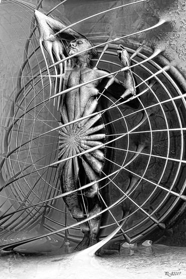 Absolutely incredible! The anatomical details on the human figure is fantastic and sleek, and the giant wheel makes the entire piece very dynamic and atmospheric. I'm also intrigued by how your work raises the question which is ultimately influencing which between humanity and technology - is the man working the wheel or the wheel putting man into motion. Truly splendid.