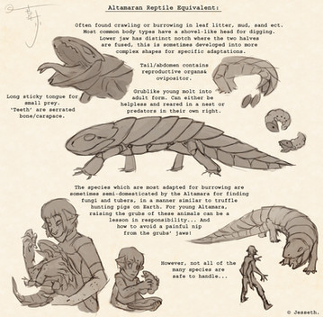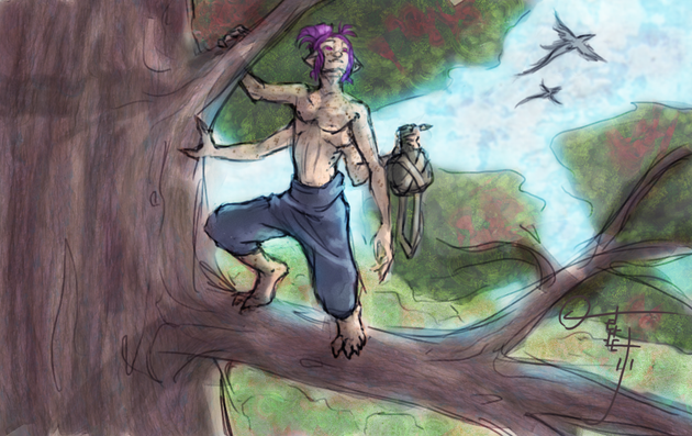 A young Altamaran trying to reach his breakfast high in the trees.They're the eggs of a large insect, and I ended up making them look a lot like ladybird eggs do: [link]