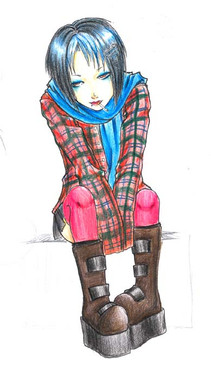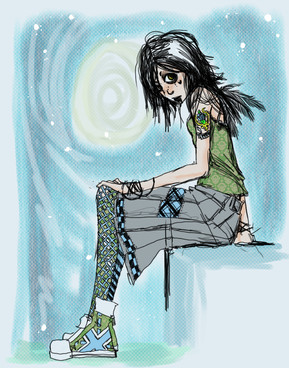I like the scetch lines on her face, as well as how the shoes are untied. I also like how the arm is hooked beneath her knee. I pay too much attention to details...